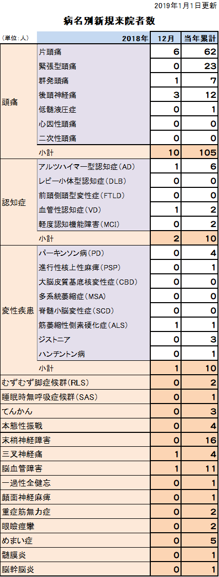 脳神経疾患診療実績 - 疾患別来院患者数 - 2018年1月 〜 2018年12月